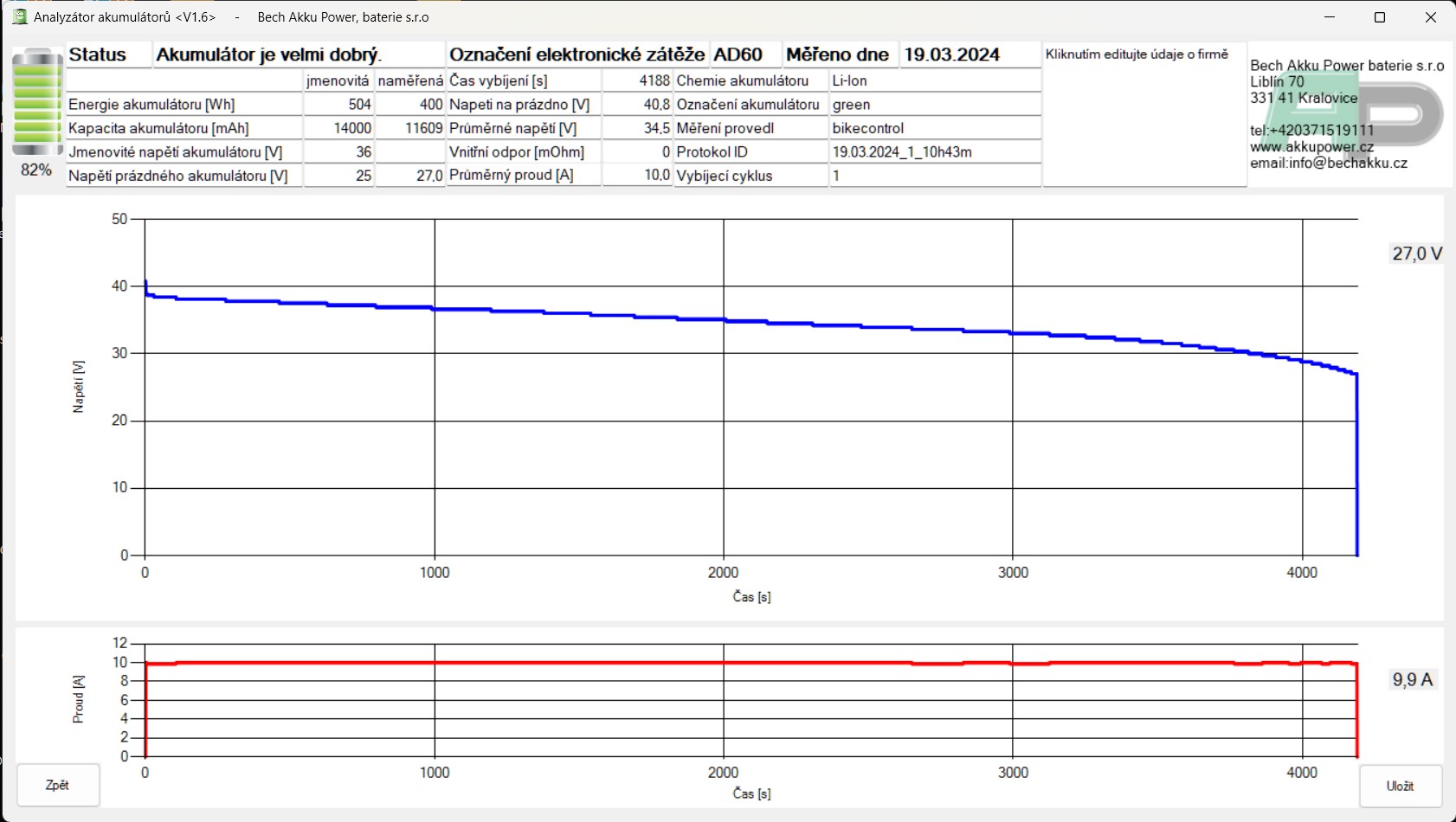 Pokud je navíc vaše baterie staršího data (4 a více let), je vhodné provést odbornou diagnostiku a zátěžový test. Ten provádíme profesionálním analyzátorem, který nám umožní zjistit přesný stav baterie a všech jejích komponentů. Výsledek zátěžového testu Vám vytiskneme a budete jej mít k dispozici, příklad takového testu můžete vidět níže: